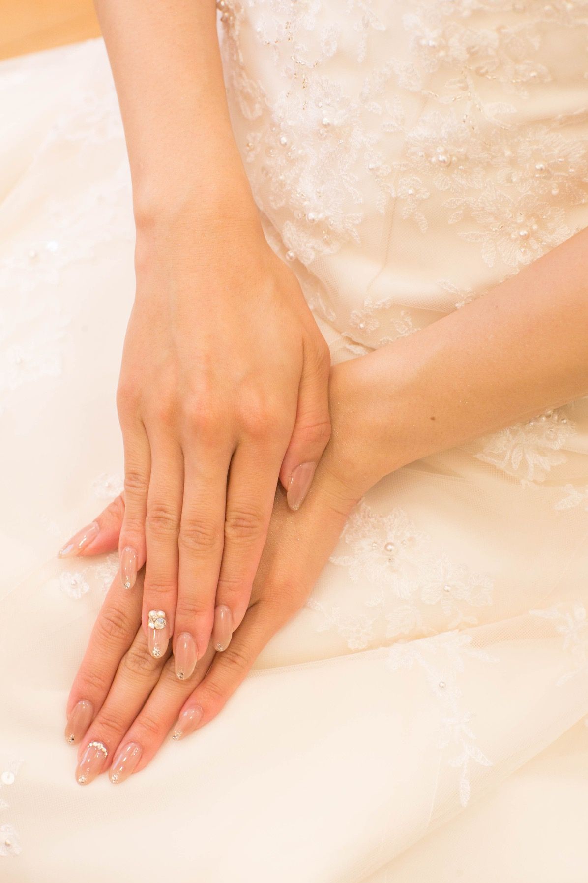 ベージュベースで、爪の先にラメ、根本に3Dアートのデザインにしました。たまたま式場の近くで、インスタで人気のあるnail rossaさまにお願いしました。