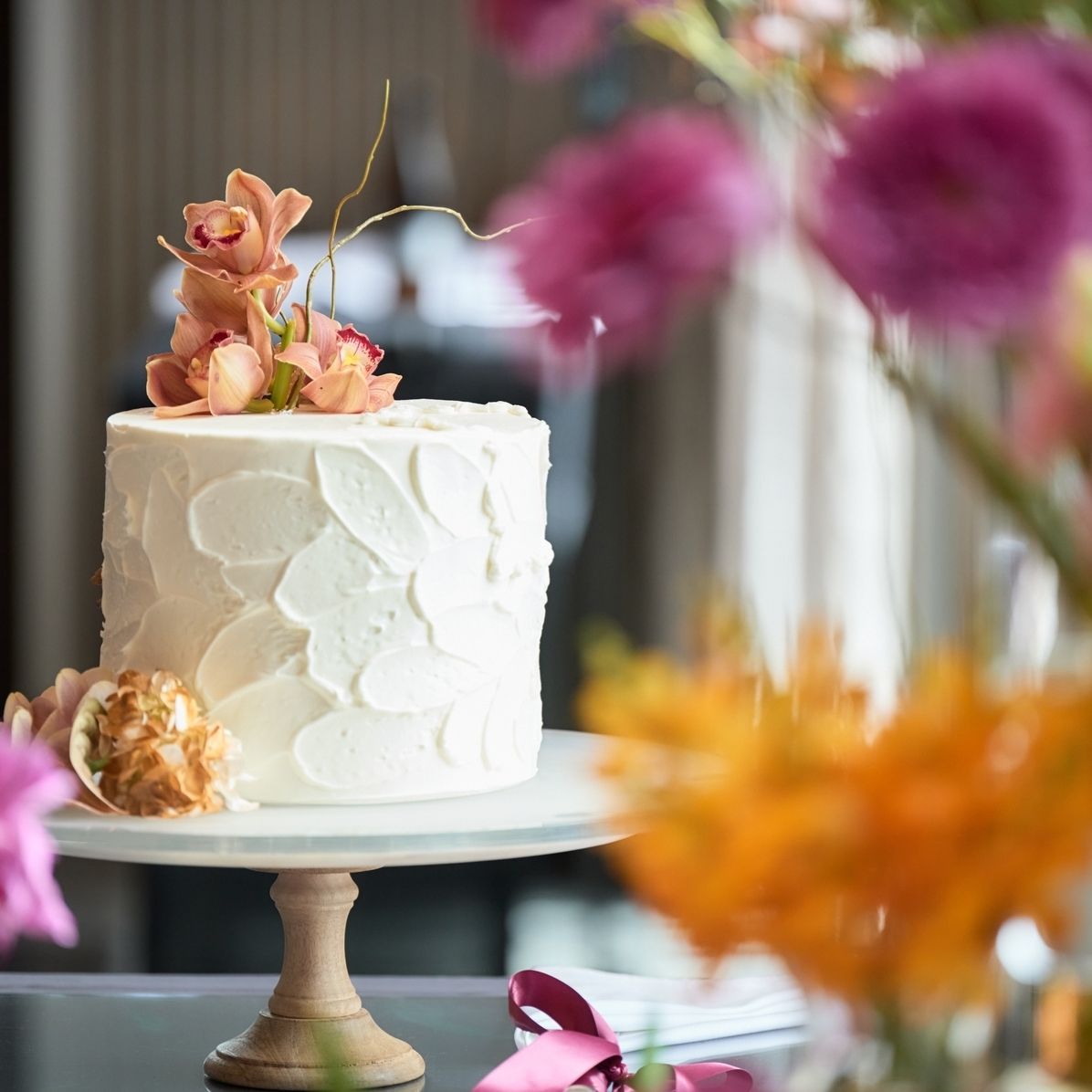 縦長のウェディングケーキにお花をポイントで置きました♪