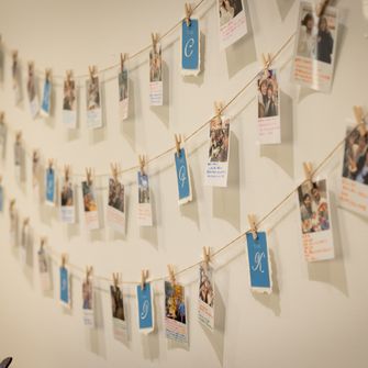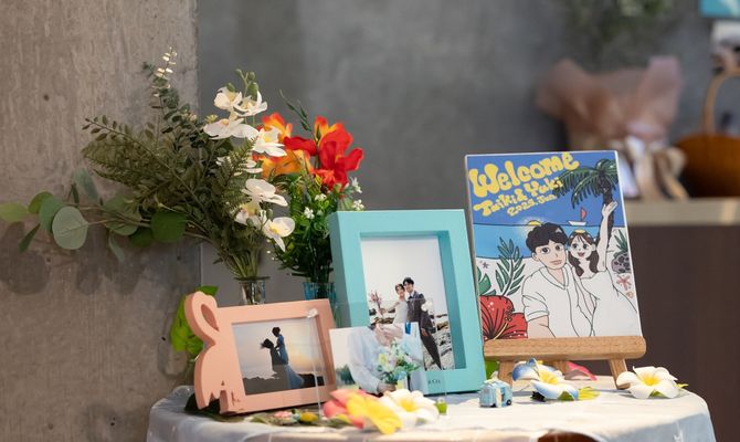 新婚旅行先のハワイをイメージし、海を感じさせる爽やかな色合いを意識して小物を飾ったり、DIYで看板を制作したりしました。