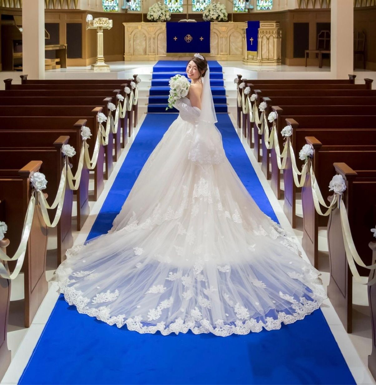もちろんステンドグラスは綺麗だし、さらにアニヴェセルはバージンロードが青なので、ウェディングドレスのトレーンが映えます!