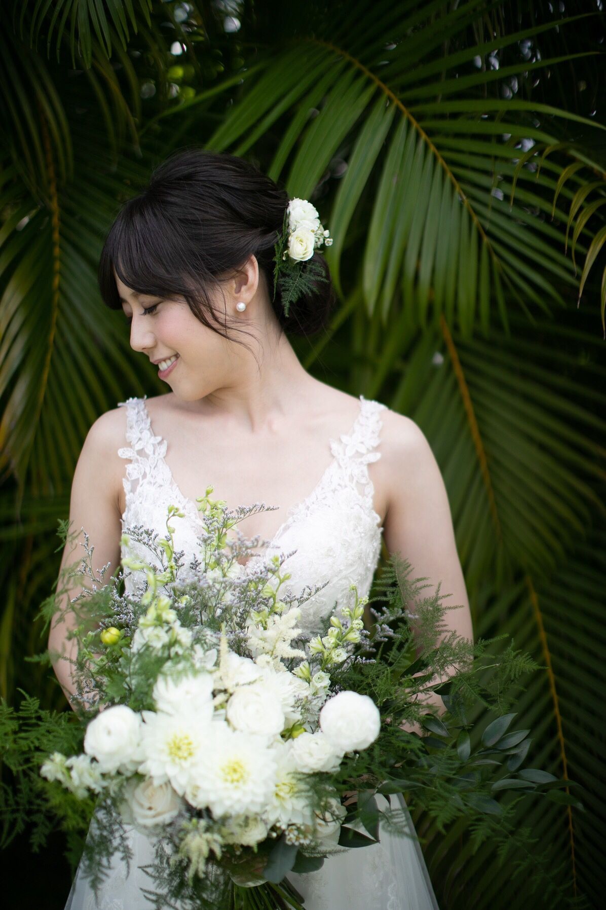 ナチュラルな雰囲気にしたく、ふんわりとしたアップヘアにしてもらい、ブーケとおそろいの生花をつけました。