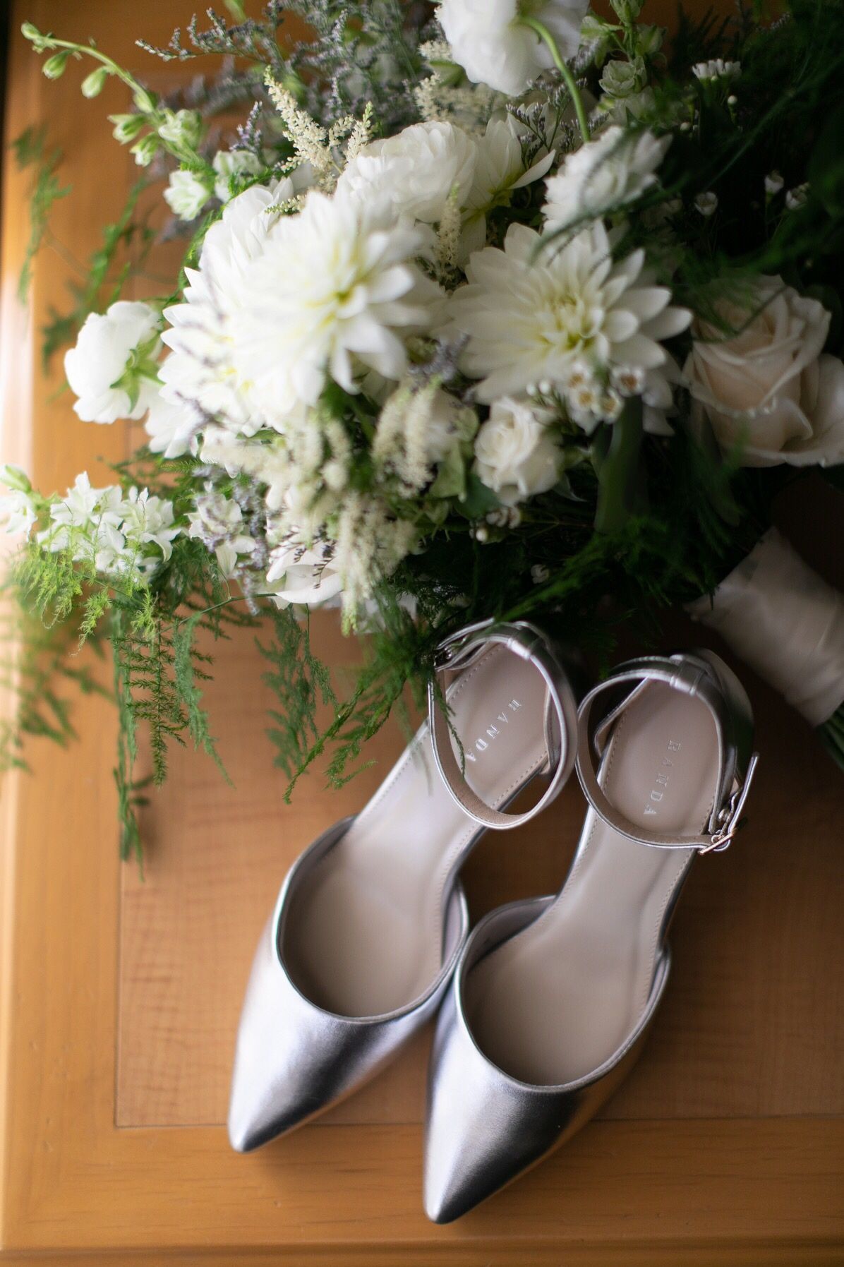シルバーパンプスにしました。ガーデンウェディングやビーチでの後撮りで、ヒールが埋まるのが嫌だったので太めのヒールにし、汚れることを前提にリーズナブルなものを購入しました。