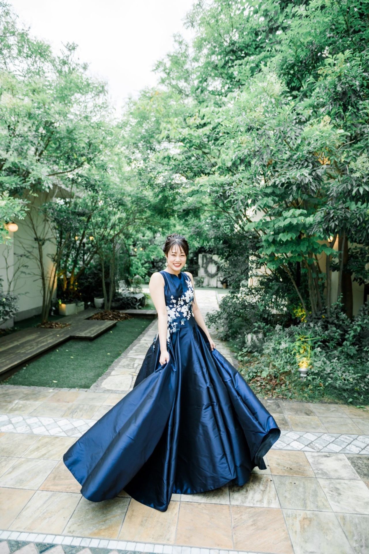 挙式とガラッと雰囲気を変えて、紺に近いブルーのドレスにしました!サテン生地のドレスは360度どこから見ても綺麗に見えるデザインで、スパンコールとビジューで作られた花柄も光が当たるとキラキラしてとても綺麗でした。