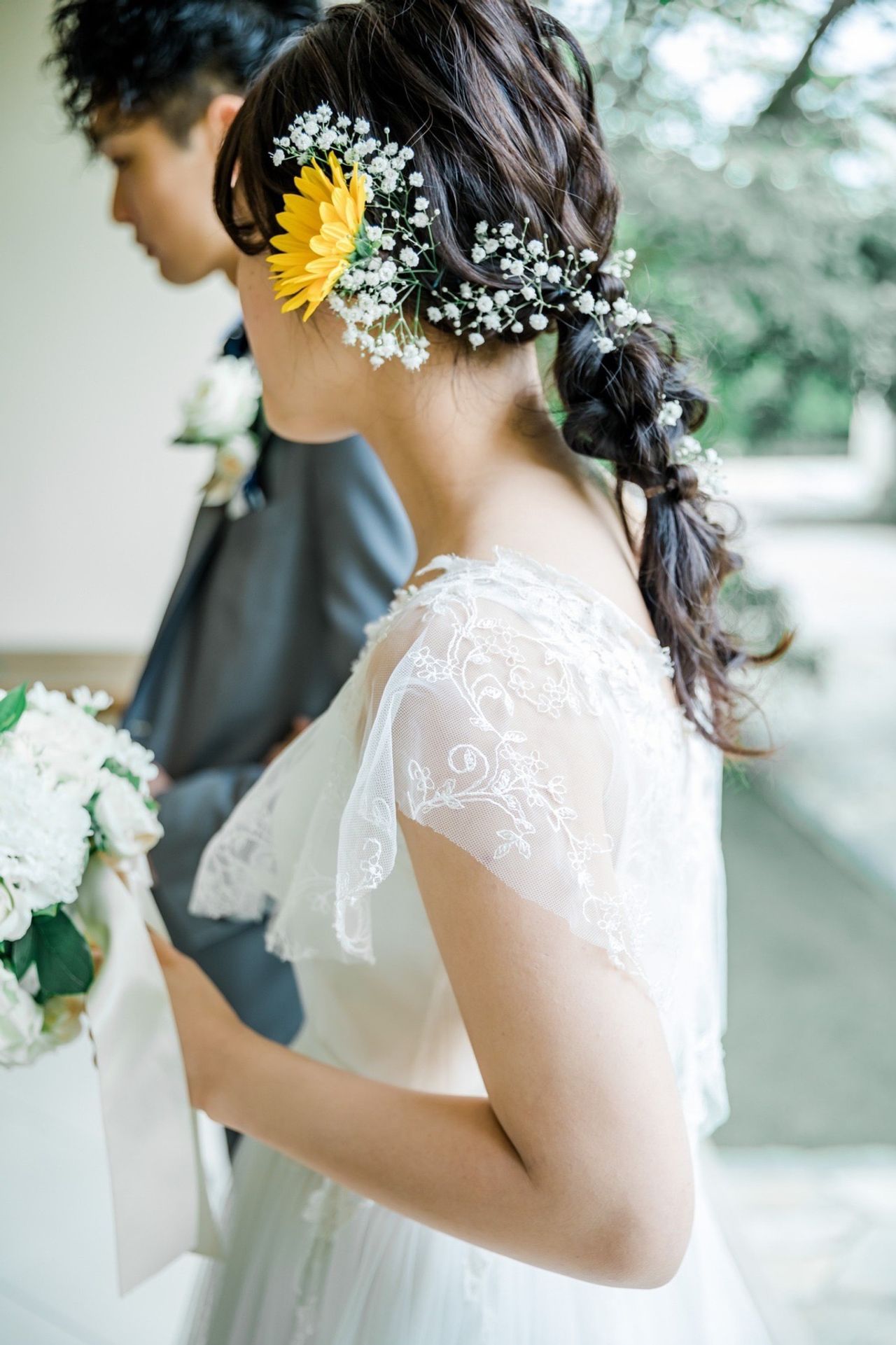 ウエディングドレスのヘッドアクセサリーはリーフモチーフのヘッドパーツをつけました!披露宴入場ではひまわりとかすみ草の生花をつけてもらいました。
