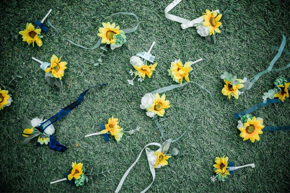 テーマ通り、装花にもひまわりをいっぱい取り入れました。ゲストの皆様に、男性はひまわりのブートニア、女性にはひまわりのリストレットをDIYし、挙式・披露宴でつけてもらいました!