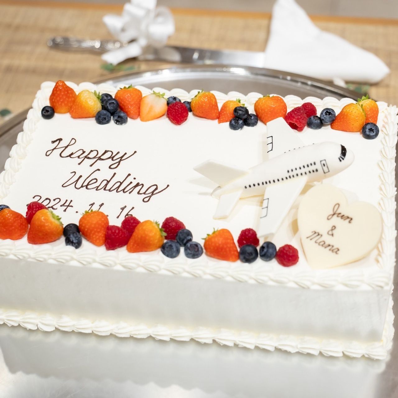 新郎新婦の仕事が航空関係なのでどうせなら飛行機をモチーフにしたデザインにしたいと思い、上に飛行機をのせたケーキを作っていただきました。