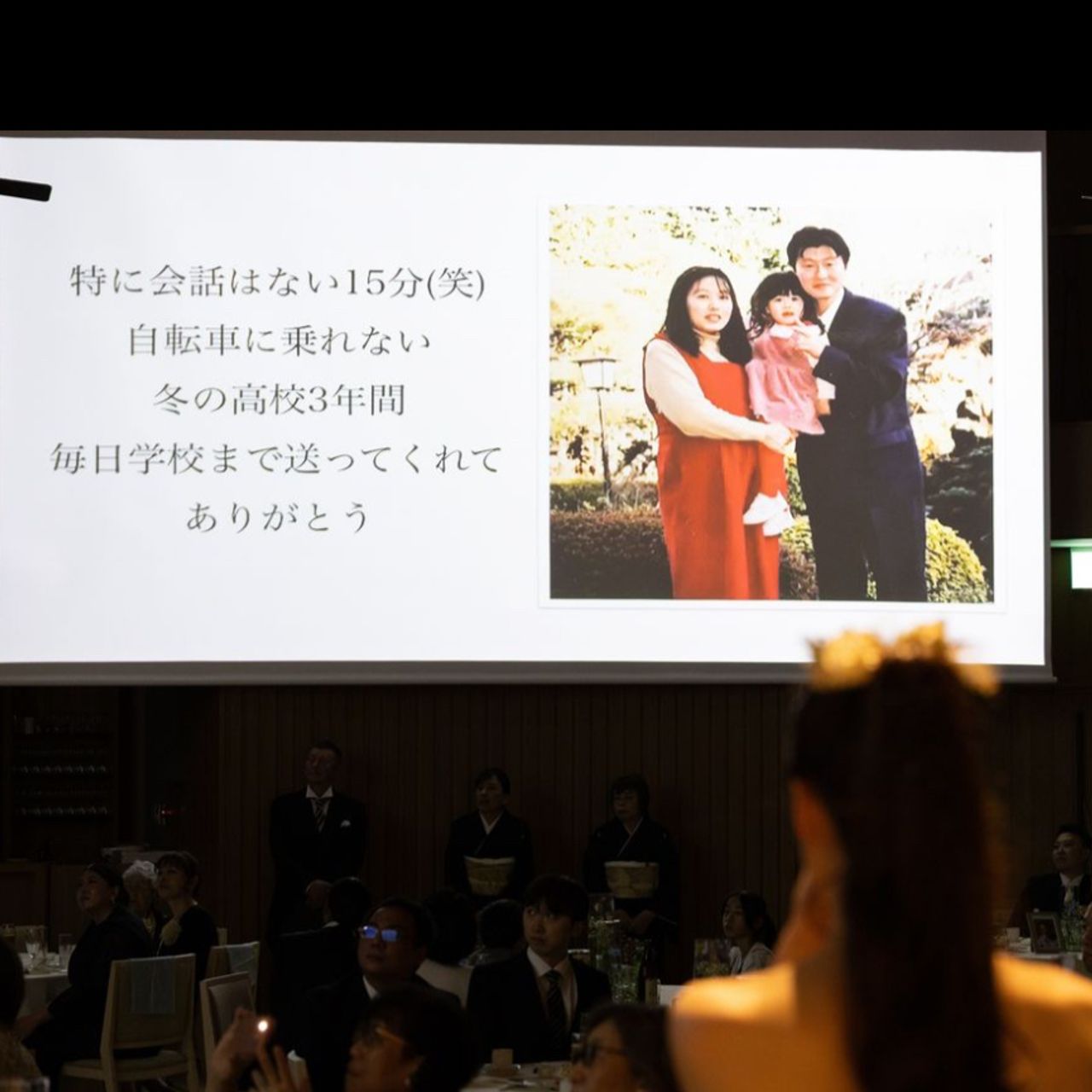 披露宴では、友人へ名札にメッセージを書き、両親への手紙の代わりにサンクスムービーを作りました。思いを込めて作ったムービーに、両親からもゲストからも「感動した」と言ってもらえたので、よかったです。両親へのプレゼントには、プロの方に描いてもらった似顔絵を準備したこともこだわりのひとつです。