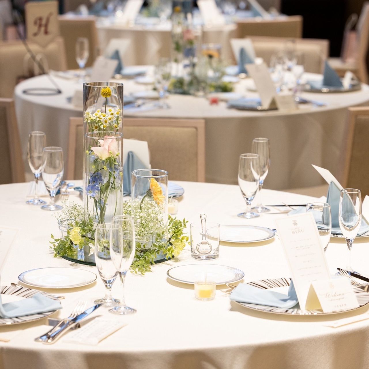 円形で広く、大きな窓があり、開放感のある会場です。会場の扉、ガーデンからの扉、階段上の扉など、入場する場所がたくさんあります。私は会場を探す前から『披露宴では階段からの登場がしたい』と考えていたので、そこも決め手になりました。