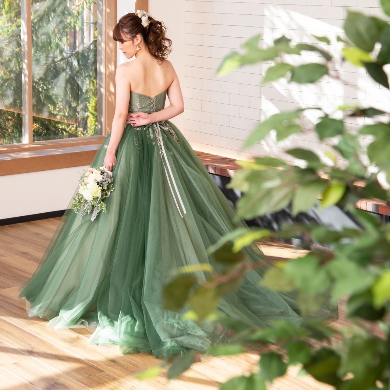 キラキラと輝く飾りと相まって、光のあたり加減や歩いたときの色合いが本当に綺麗です。たくさんの新しいドレスが出る中、このドレスも5年前に決めたものと同じです。5年経っても好みは変わりませんでした(笑)