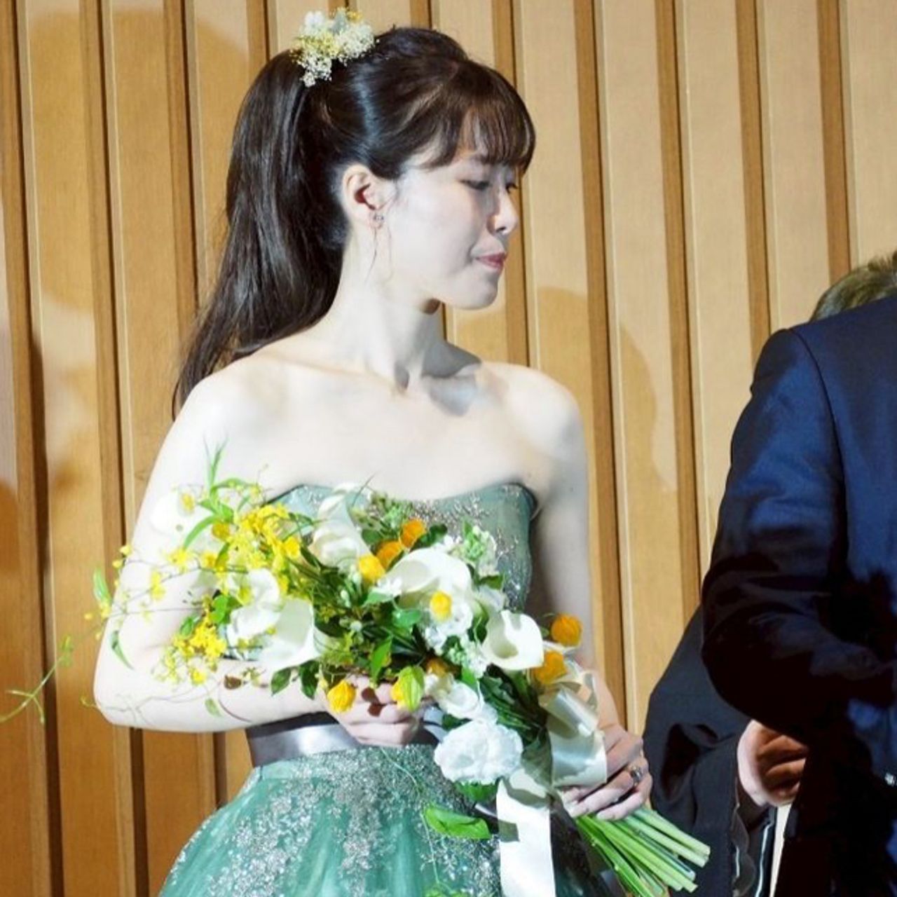 カラードレスでは、全体のバランスを見て、ネックレスはつけず、小さめのイヤリングを合わせています。
