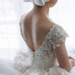ざっくり開いた背中と、3mのベールより長いスカートのトレーンが特徴です。