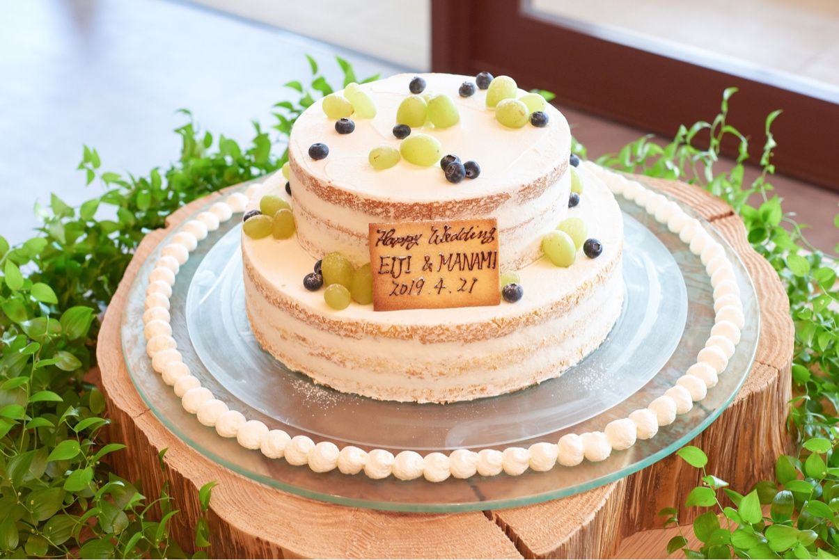 ブルーベリーとマスカットを乗せたネイキッドケーキで、オレンジのカラードリップをしました。
