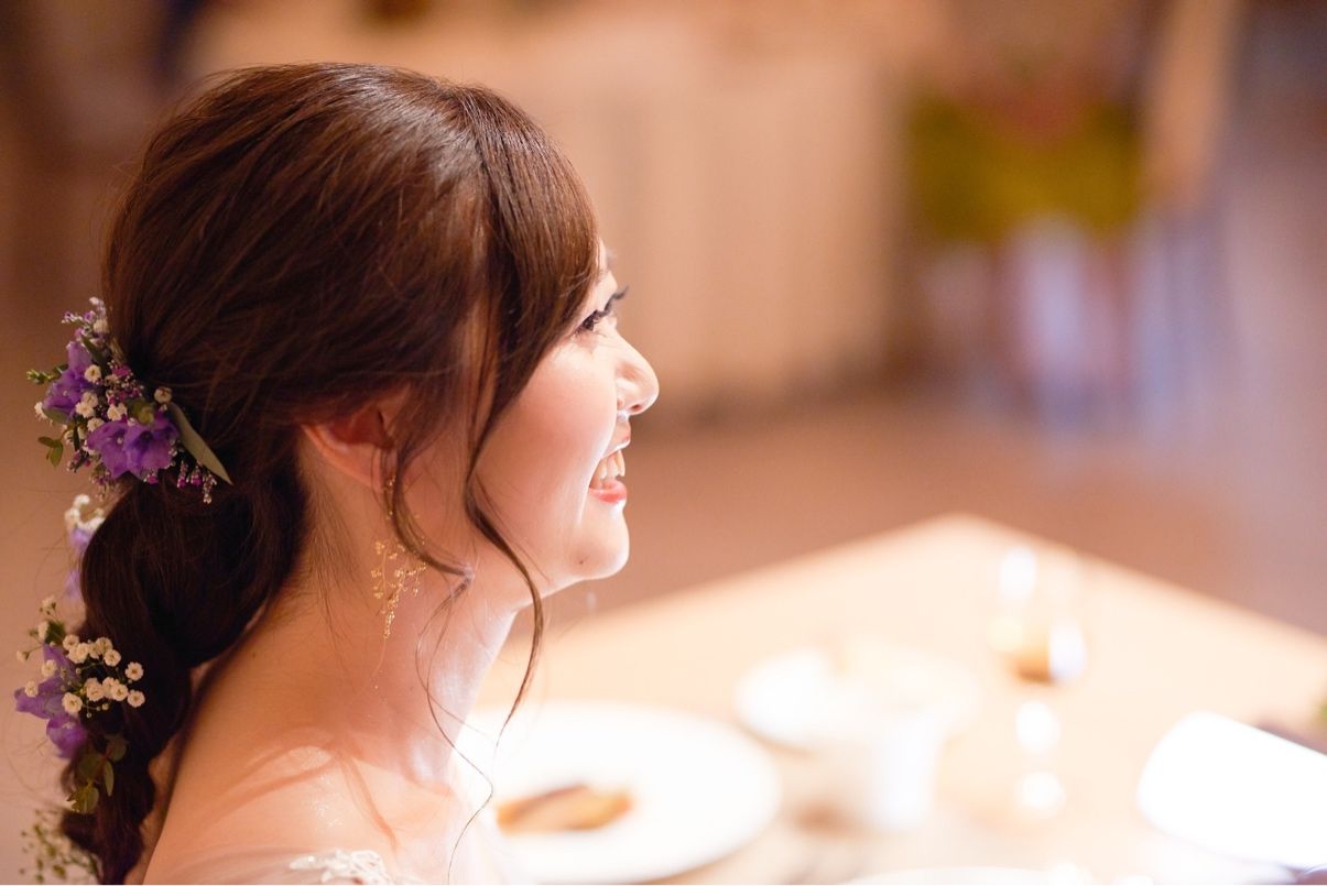 ウェディングドレスでは小枝風のヘッドアクセサリー、カラードレスではブーケに合わせた生花を準備してもらいました。