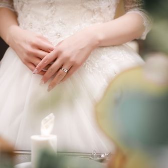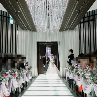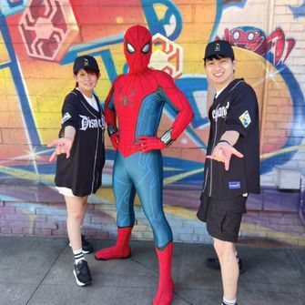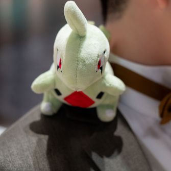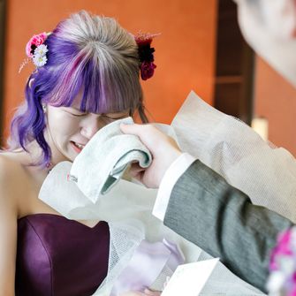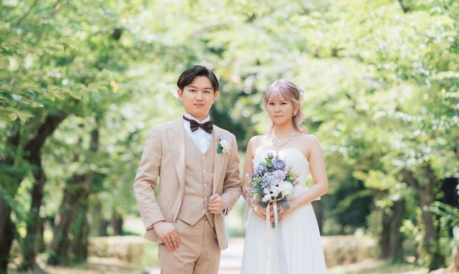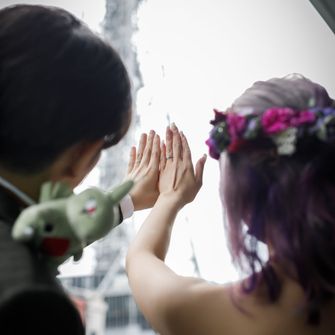 新郎は緑のタキシードの肩にヨーギラスを乗せ、