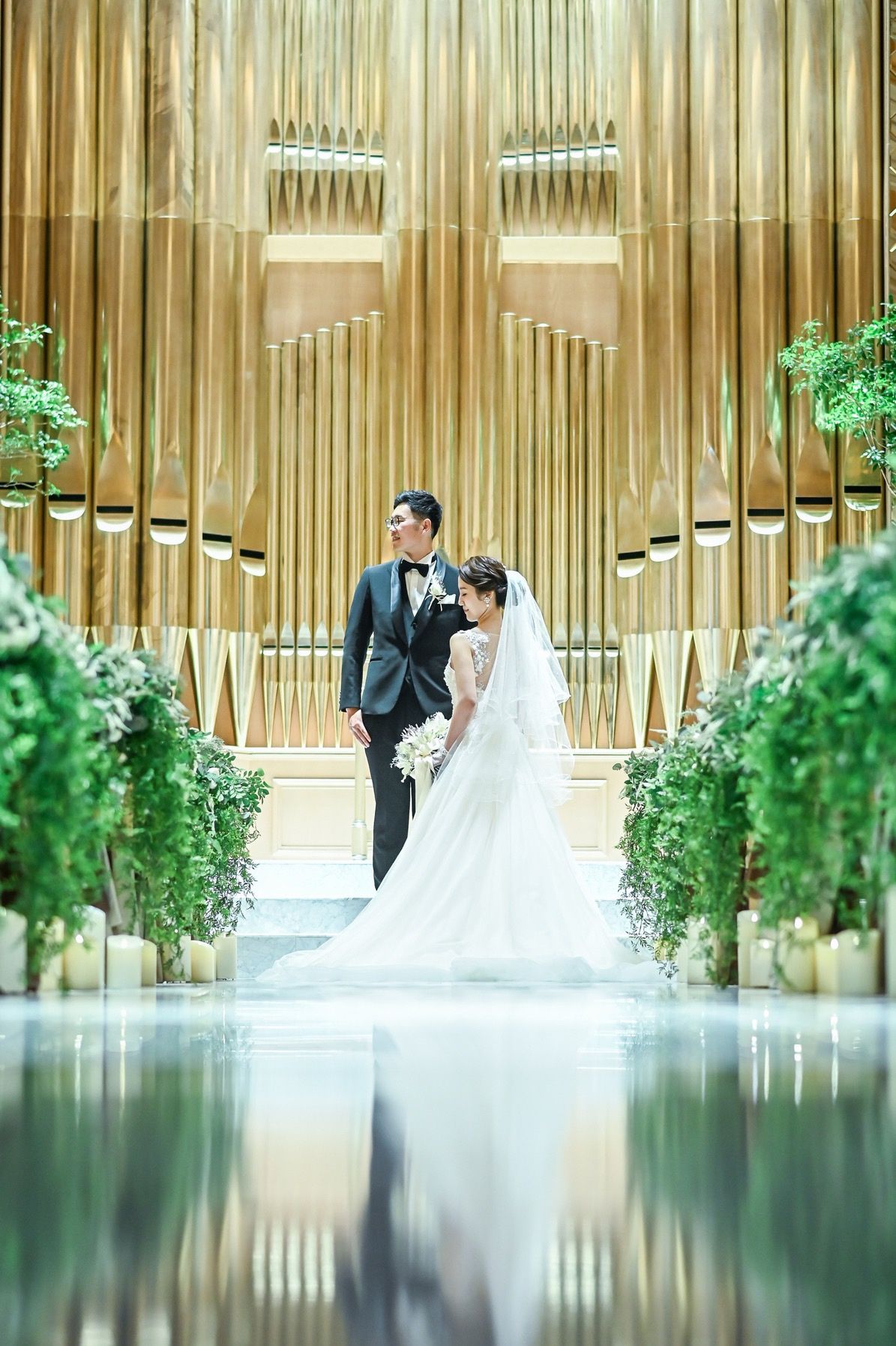 チャペル内はゴールドを基調にした空間で、他の式場にはない神聖な雰囲気です。照明の明るさを調節することができるので、自分の理想の雰囲気を作ることができます。私は入場前は照明を落としてもらい、入場後は明るくしてもらいました。また後方に防音ルームがあるので、お子様連れのゲストがいる場合、新郎新婦とゲストの双方にとって安心だと思います。