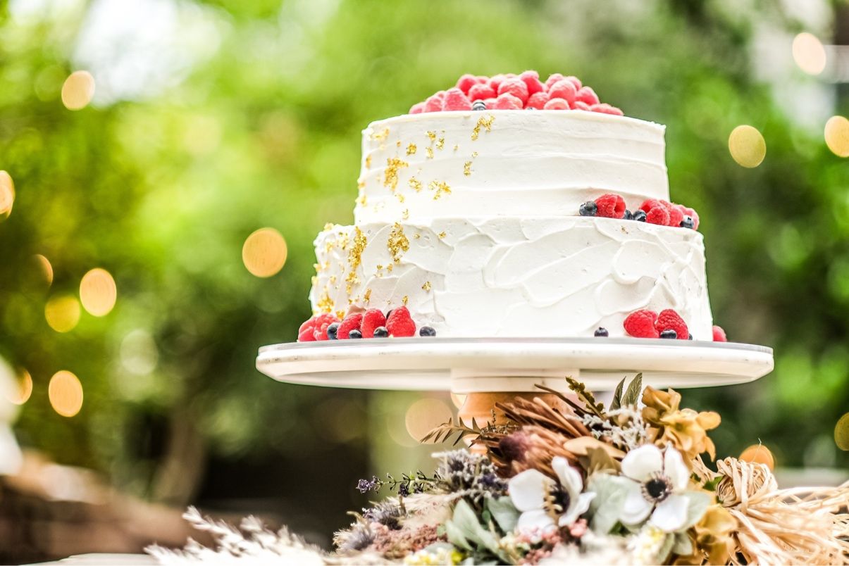 2段のウェディングケーキです。壁面のクリームの塗り方を1段目と2段目で変えてもらいました。フルーツはブルーベリーとラズベリーのみ、飾りに金箔を使用しました。