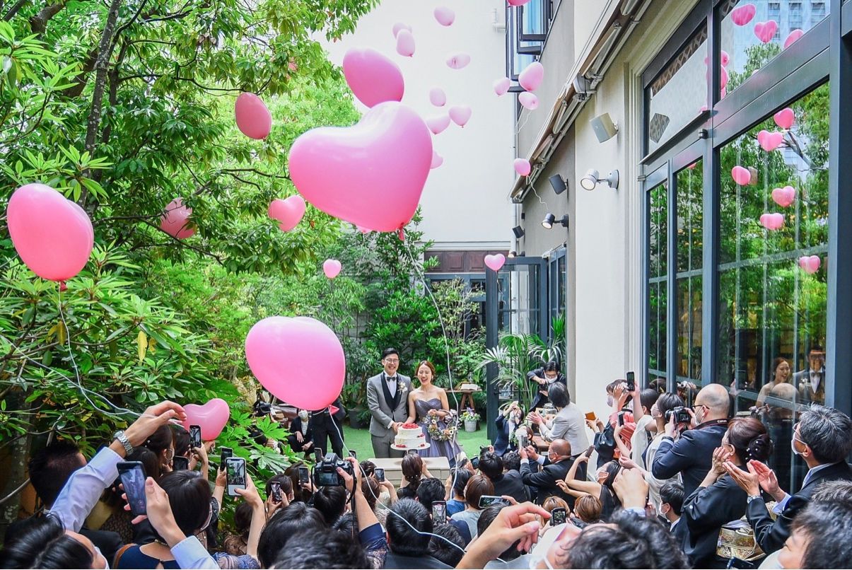 ケーキ入刀時のバルーンリリースです。もともとブラスグループの他の式場でこの演出をされている花嫁さんの投稿を見て「私もやりたい!」と思ったのが始まりでした。当日、ケーキ入刀のためにゲストが続々と披露宴会場からガーデンに出てきてくれたのですが、自分にとって大切な人たちが可愛いピンクの風船を持ちながら私たちの目の前にぎゅっと集まった光景が私にとっては本当に幸せで、一生忘れられない夢のような時間になりました。天候に左右されるのでイチかバチかで取り入れた演出ではありましたが、当日は空が本当に綺麗で無事実施することができて本当によかったです。