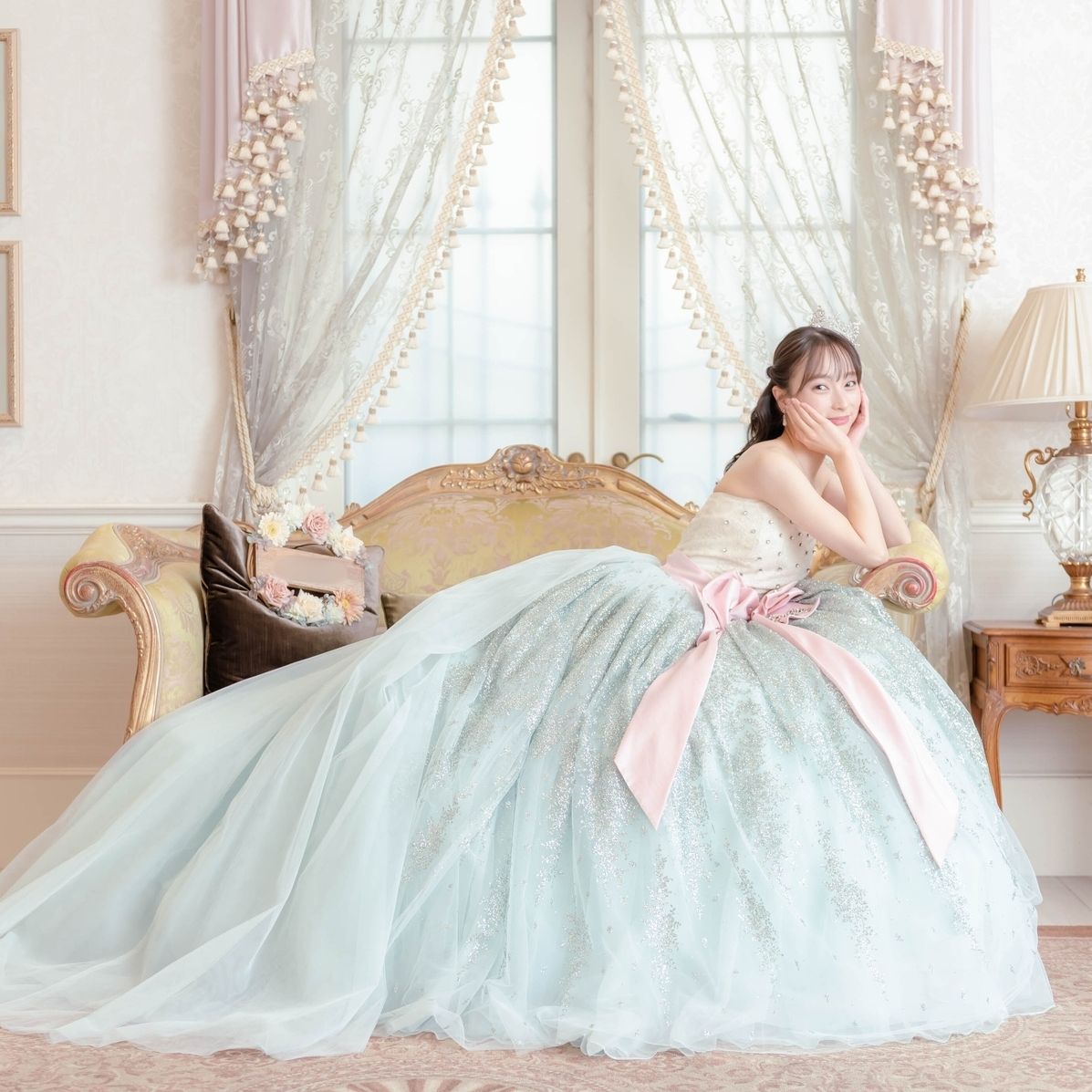 水色のドレスではミニクラウンを着用しました。斜めの位置に固定したのがポイントです!