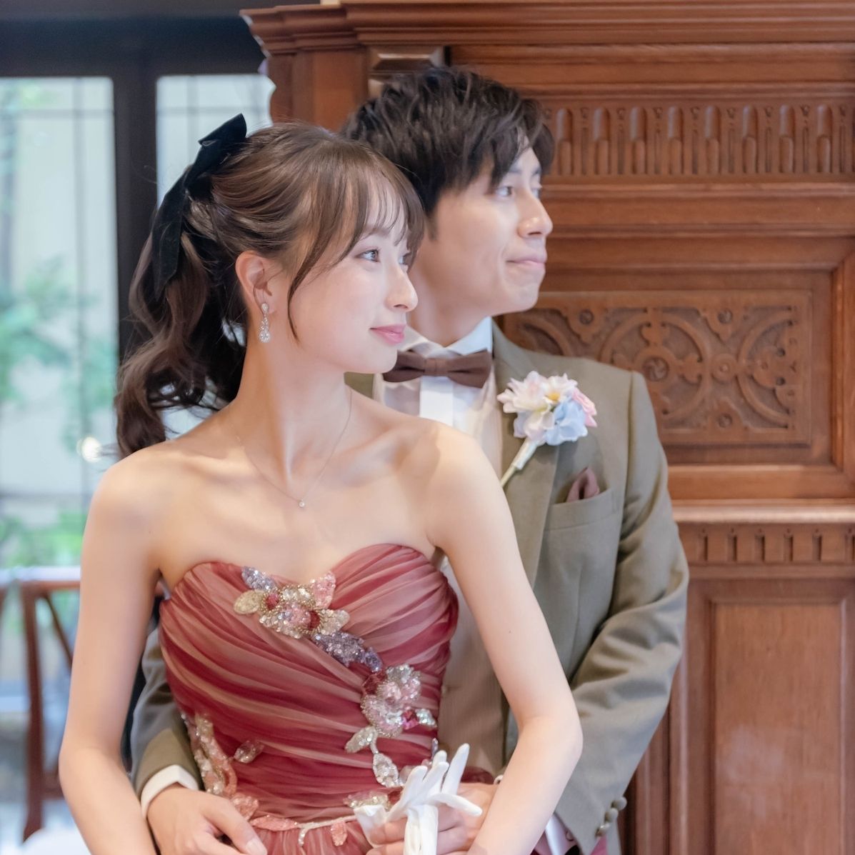 ヘアについては、ウェディングではティアラ×シニヨン、水色のドレスでは小さめクラウン×ハーフツイン、赤色のドレスではリボン×ポニーテールで本番に臨みました!アップ、ダウン、アップスタイルで変化をつけています♪