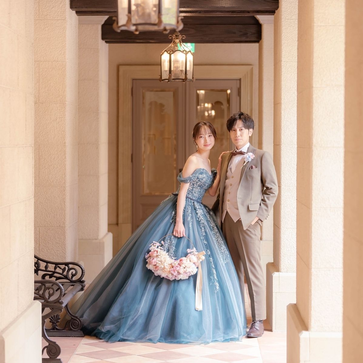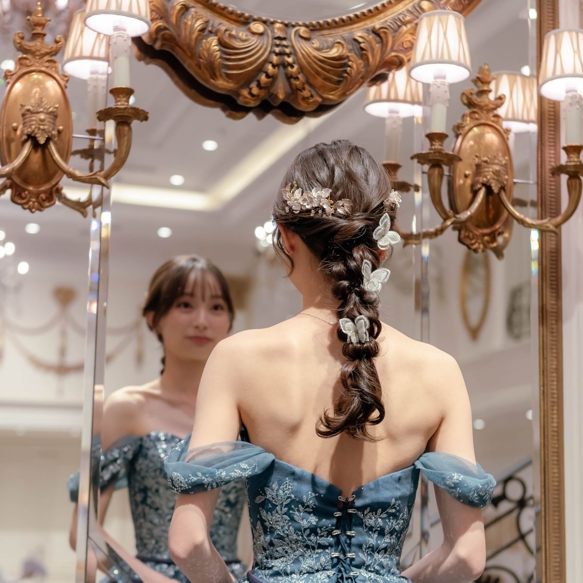 前撮りで着用した青のドレスには、花×蝶々×編みおろしで合わせました。