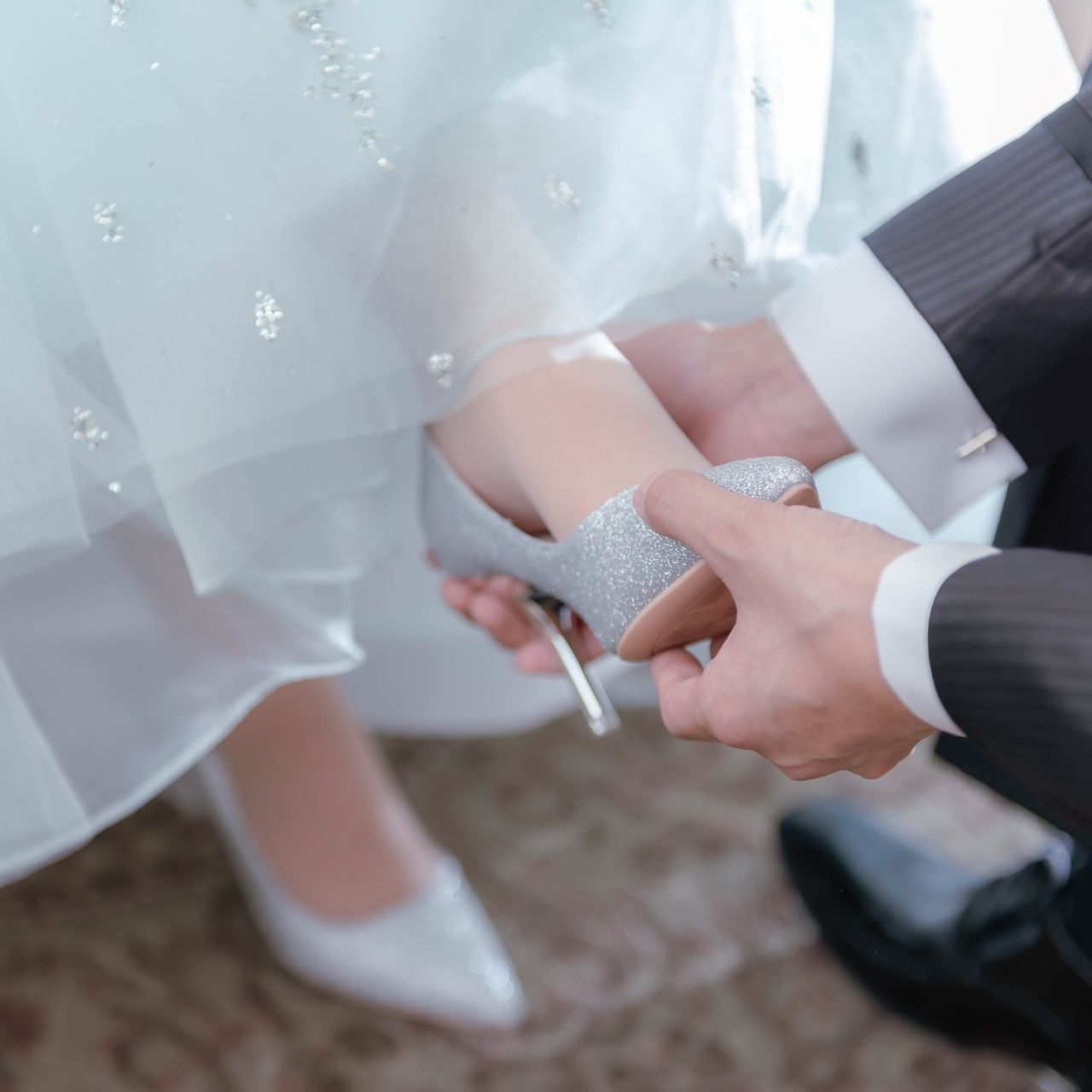 シルバーのグリッターで、7cmの高さのピンヒールを着用しました。