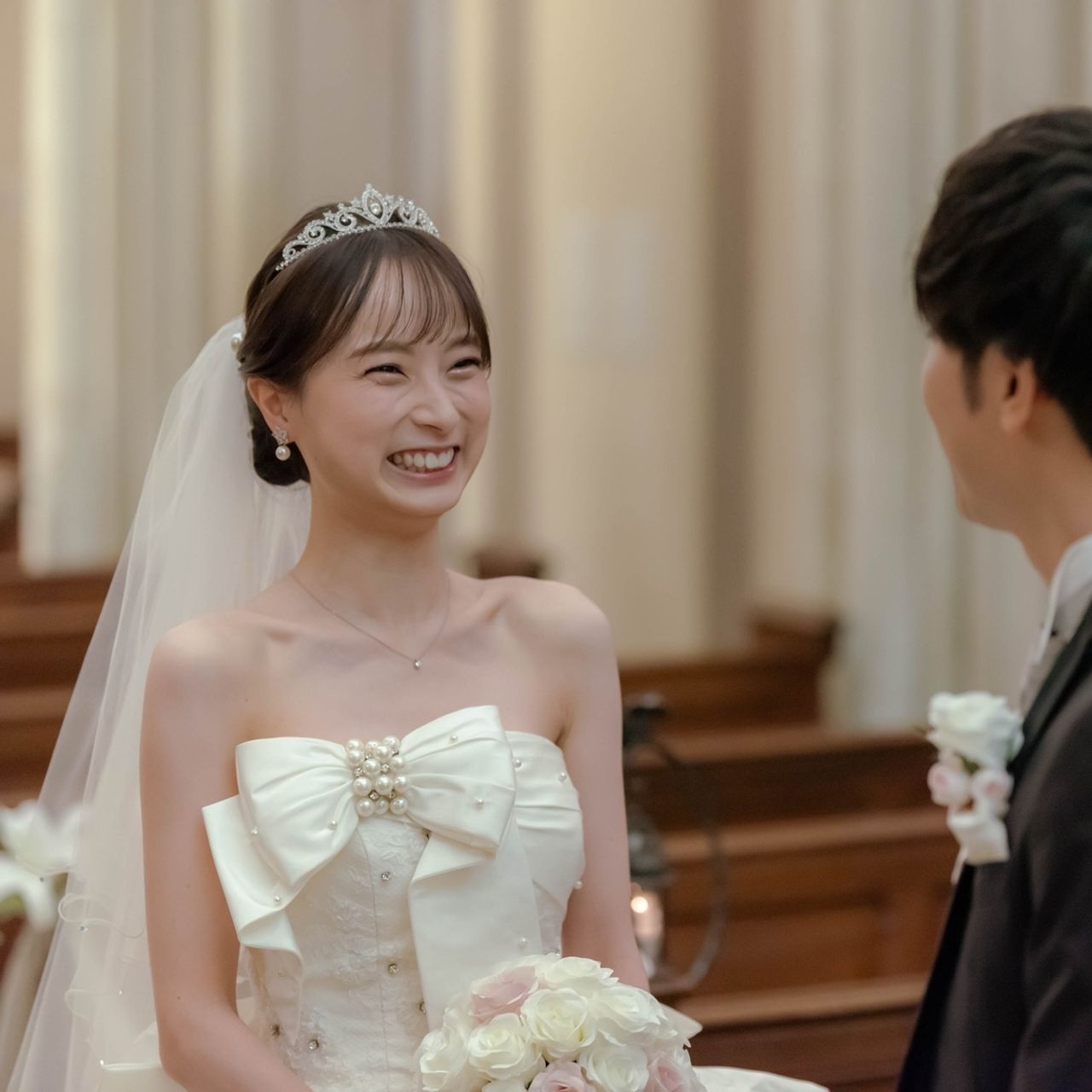 ウェディングドレスにはティアラ×パールピンを合わせています。