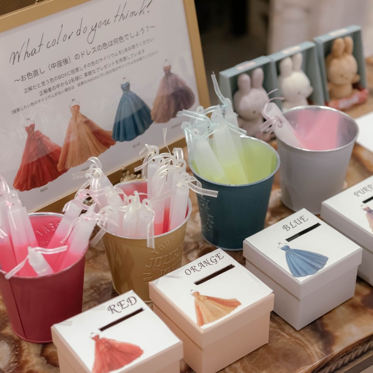 写真に映るドレス当てクイズや細かいグッズ類が少しズレたり、斜めになったりしていたことが後から見て気になりました。
