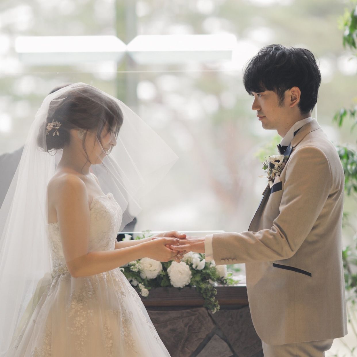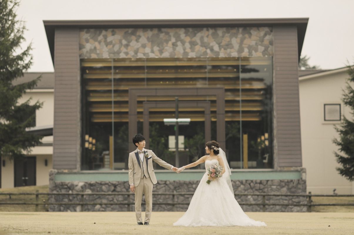 フォレスターナの光のチャペルは、祭壇の前面がガラス張りになっていて軽井沢の木々や空、芝生などの自然が広がって見えるのでとても開放感があります。挙式の日は雨が降りそうなくもりの天気だったのですが、光がたくさん入る空間なので、明るくて素敵な写真をたくさん残していただけました!