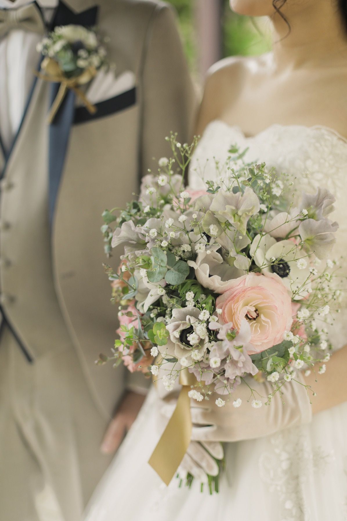 ブーケにはかすみ草、ラナンキュラス、アネモネなど絶対に入れてほしい季節のお花は要望を伝え、あとは好みの色味に合わせてお任せで作っていただきました。