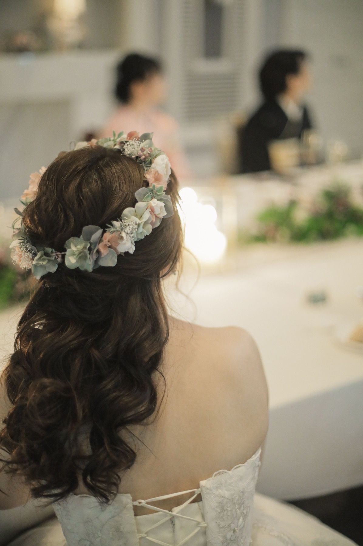 挙式はシニヨンで、後れ毛をたくさん出してもらい、ゆるふわ感を意識しました。披露宴は伸ばした髪の長さがわかるよう、お気に入りの花冠に合うハーフアップにしてもらいました。