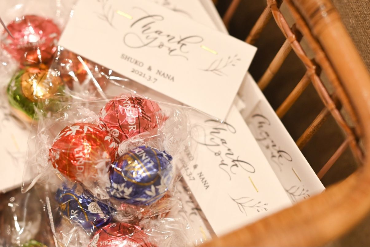 名前や日付を入れたものをDIYし、ひたすらラッピングしました!!ゴールドのホチキスを使ったのも拘りポイントです♪