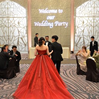 ナチュラルさとクラシカルなイメージで、ウェディングドレスはタキシードを黒カラードレスを赤にこだわりました。