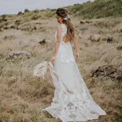 ガーデンウェディングとハレクラニでの撮影、両方に合うドレスを探していました。カジュアル過ぎず、ゴージャス過ぎないドレスです。チュールをふんだんに使った、MirazwillingerのFionaを見た時これだ!とピンッと!