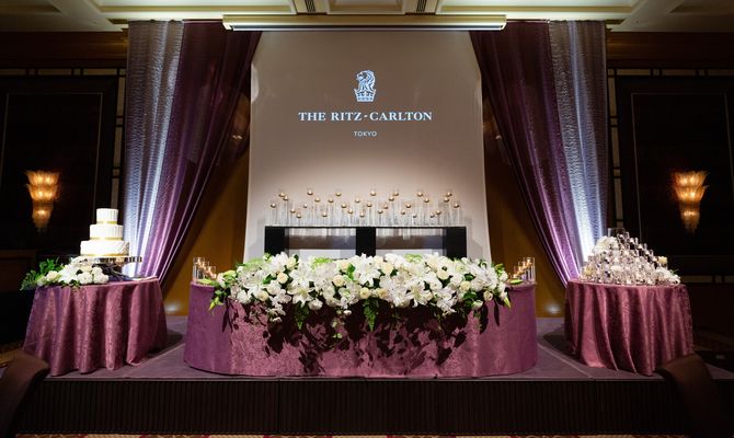 重厚感を出すためにまず考えたのは、色味の統一です。絨毯や壁紙が紫なので、装飾幕とクロスは同系統のラベンダーをチョイスしました。また会場全体が明るく見えるように、自分が好きな色のホワイト×ゴールドの3色で統一しました!