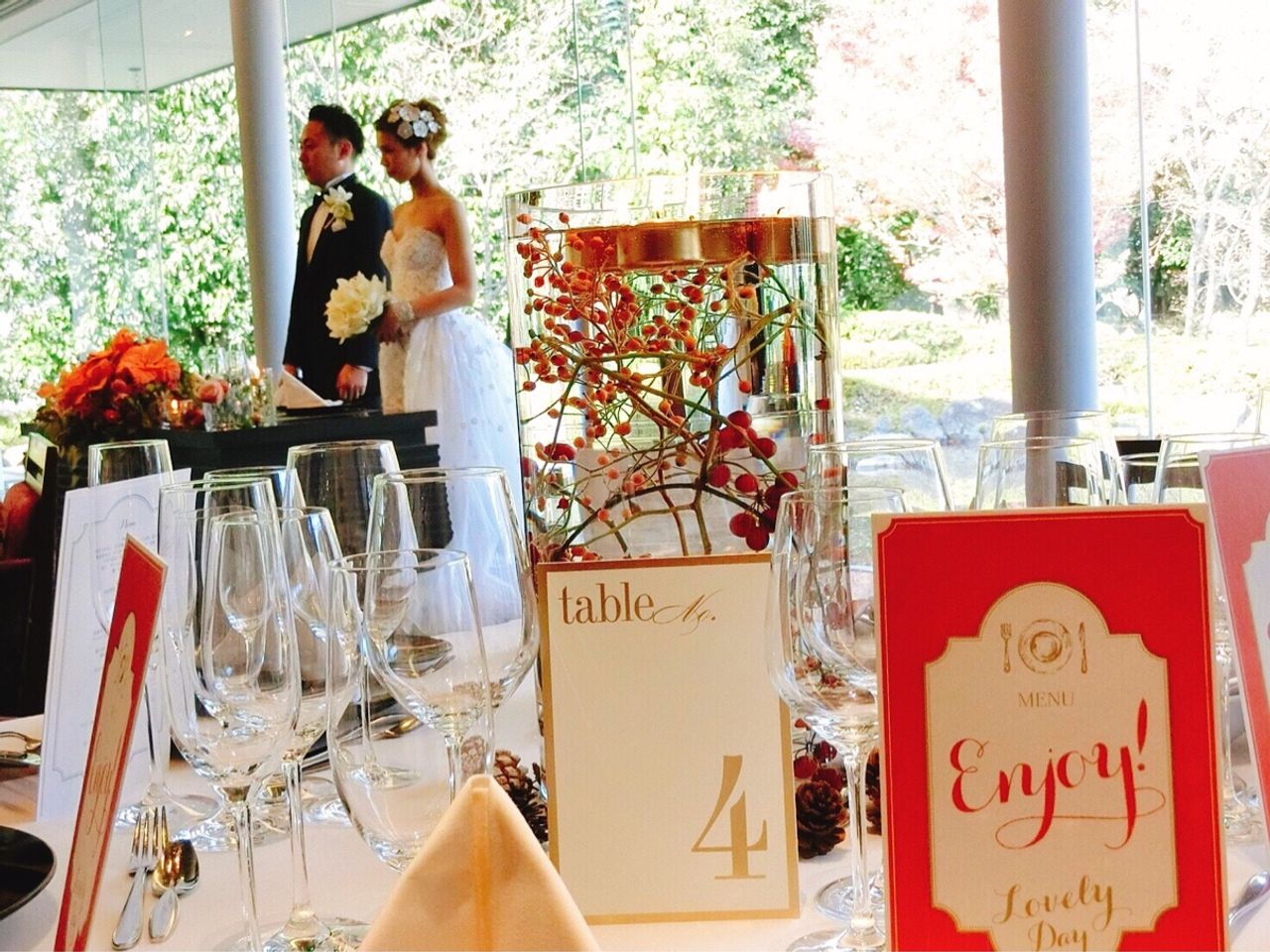 高砂はポインセチアを、ゲストテーブルには赤い実の水中花にしました。
