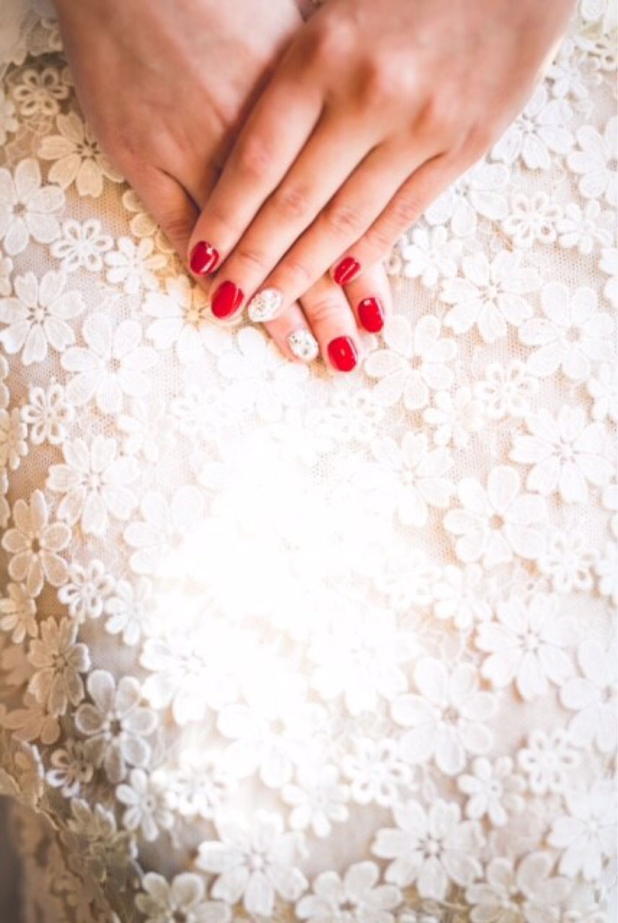 ネイルは白いドレスにも映え、お色直しの時のメイクにも合うように赤をベースにキラキラも入れました。