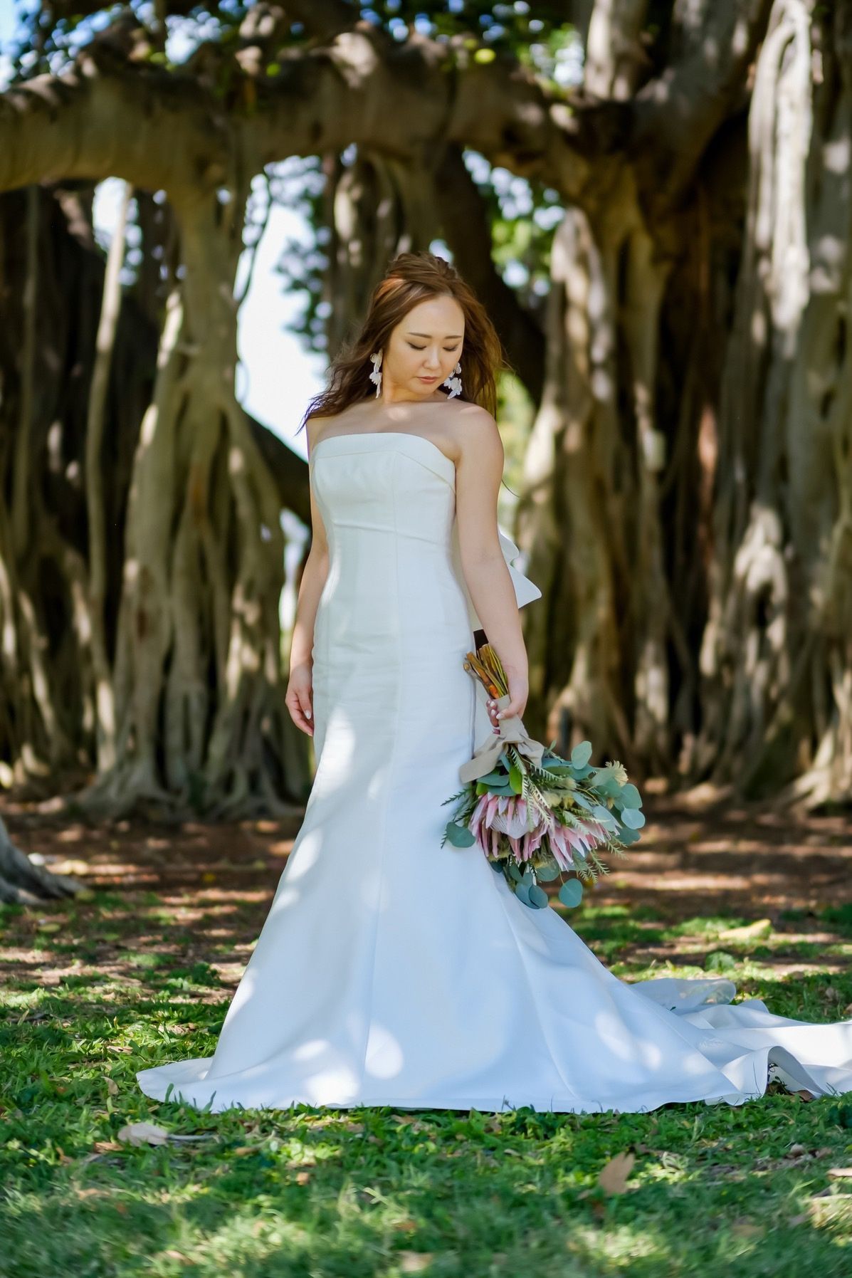 提携先のドレスでした。マーメイドのシンプルなドレスに後ろは普通のシンプルなリボンを大きなお花の様にまとめてもらってそれを縫い付けました。