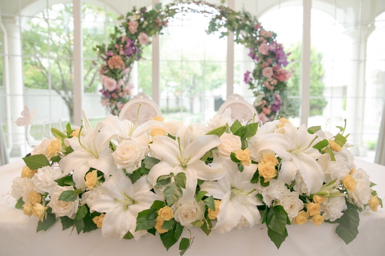 私が選んだ披露宴会場は、ガーデン側をメインテーブルにすると後ろに大きなグリーンのリースがあり、写真を撮るときにとても映えるのが良かったです。友人からも、可愛かった!と好評でした。椅子のデザインも可愛くて気に入っています。