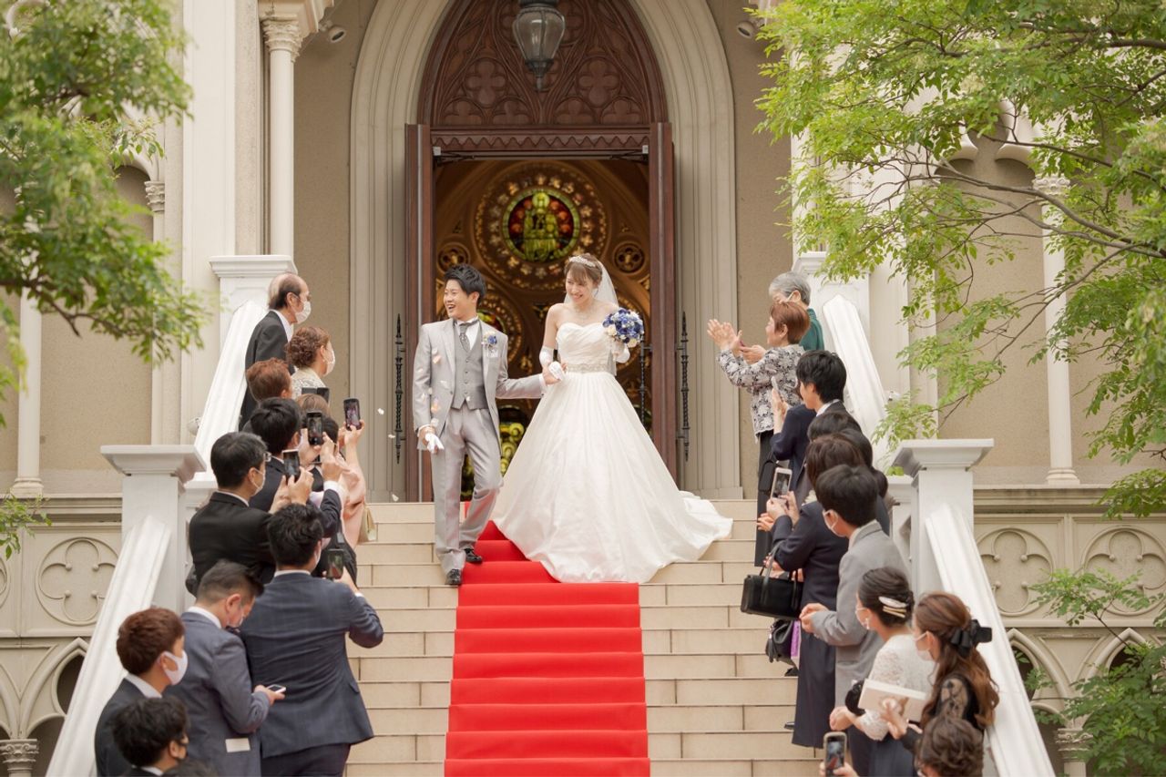 ステンドグラスがとっても綺麗で、レッドカーペットが敷かれた大階段が魅力的なチャペルでした。写真を見てもみんなとてもいい笑顔で、結婚式の幸せがそこに現れていました。
