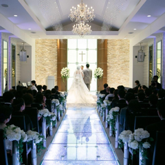 バージンロードにスワロフスキーに見立てたものが敷き詰められていたり、青や緑などに色が変化するので、歩くとドレスから光が漏れてすごく綺麗でした。