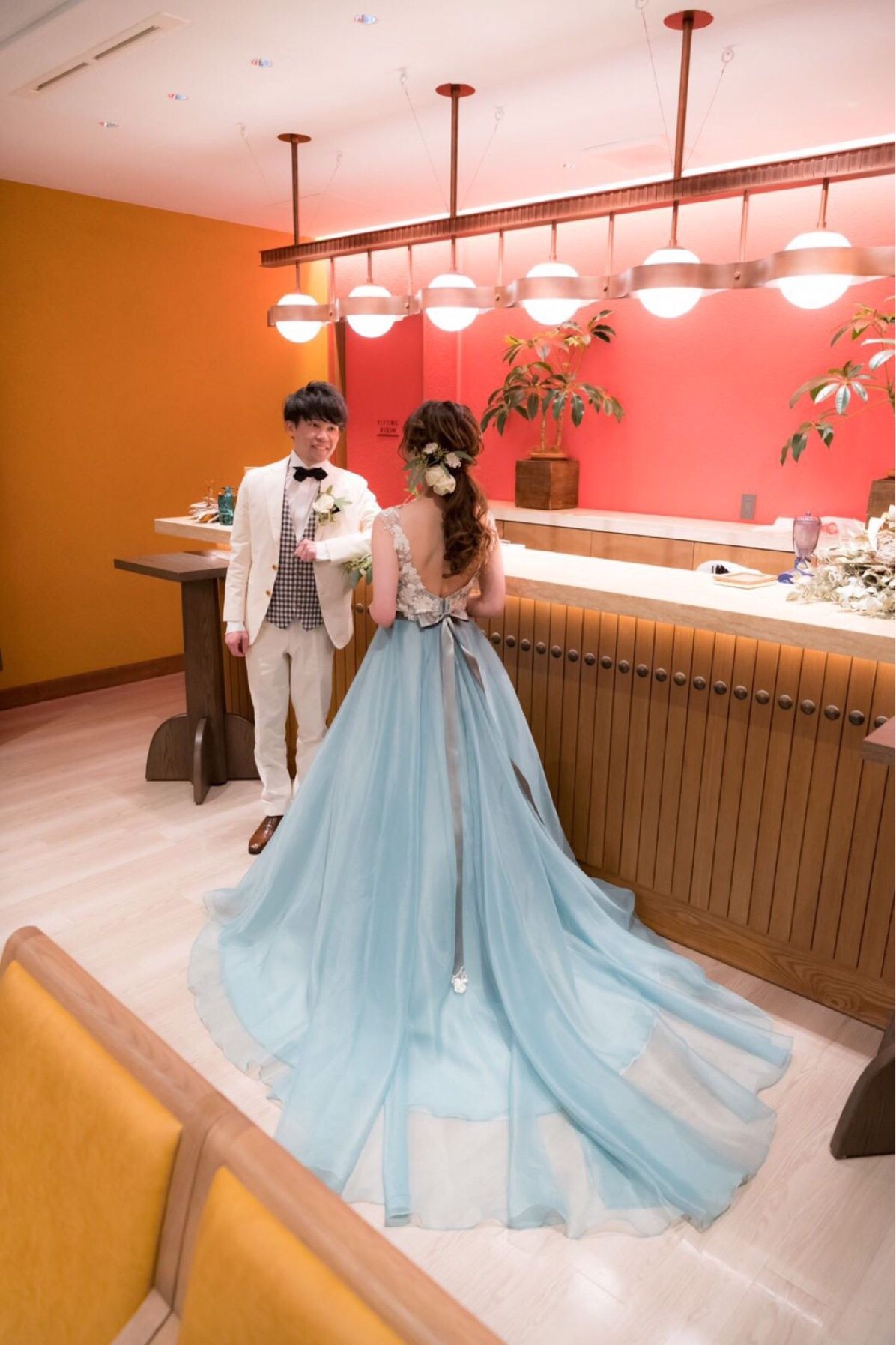 緑・ブルーっぽいカラードレスを借りました。テーマが海だったので、緑・ブルーっぽいドレスにしました。こちらもレースが可愛く、背中が開いていてとても可愛いデザインでした!