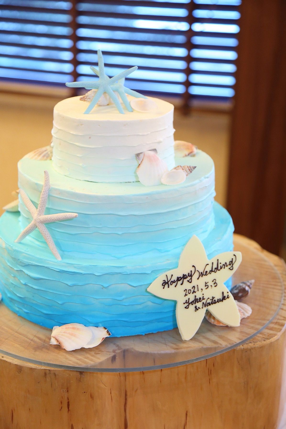 青すぎず、けれど海を感じられるケーキにしたくてグラデーションにしました!中身は持ち込んだイチゴを沢山使っていただきました!