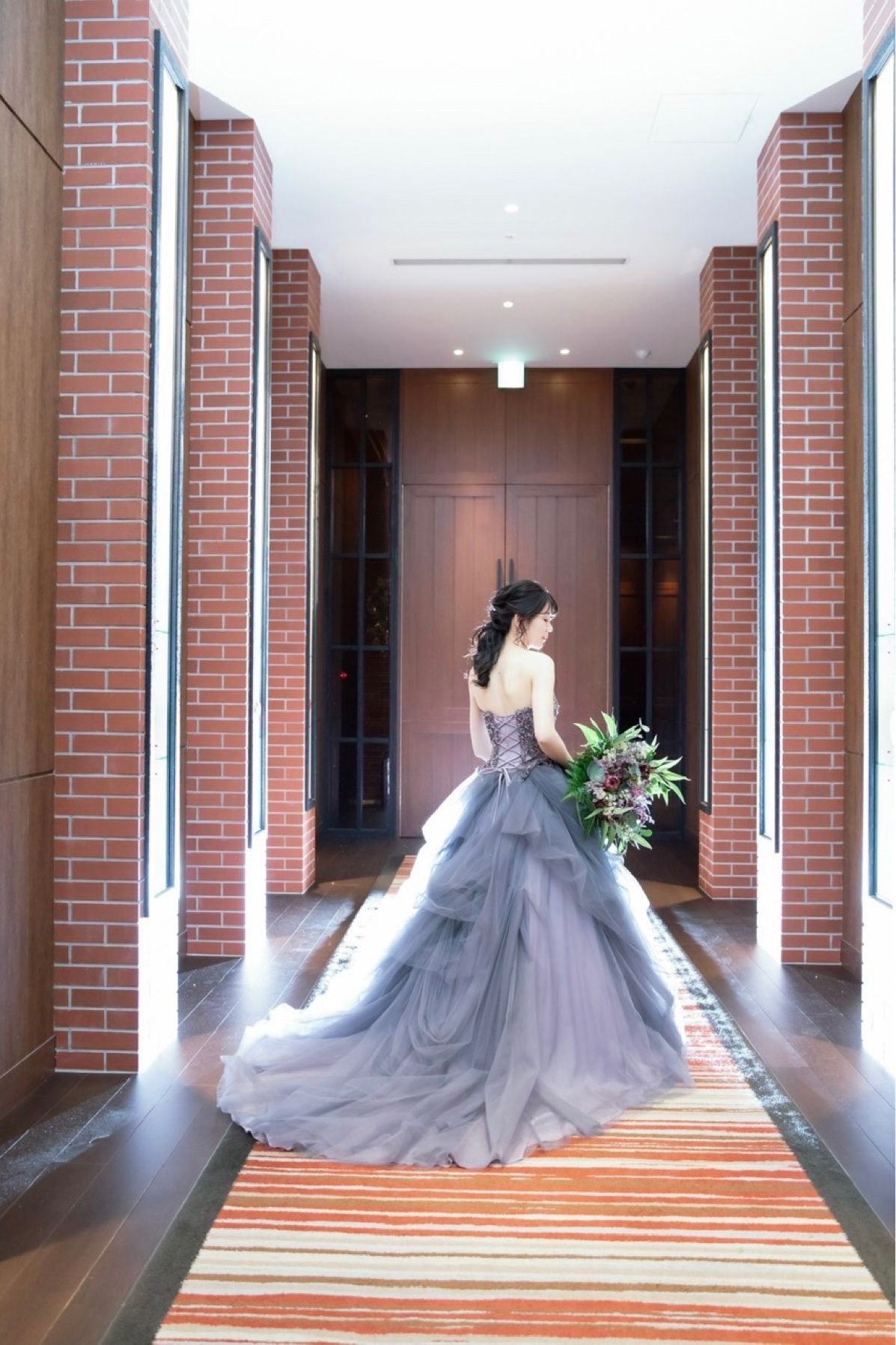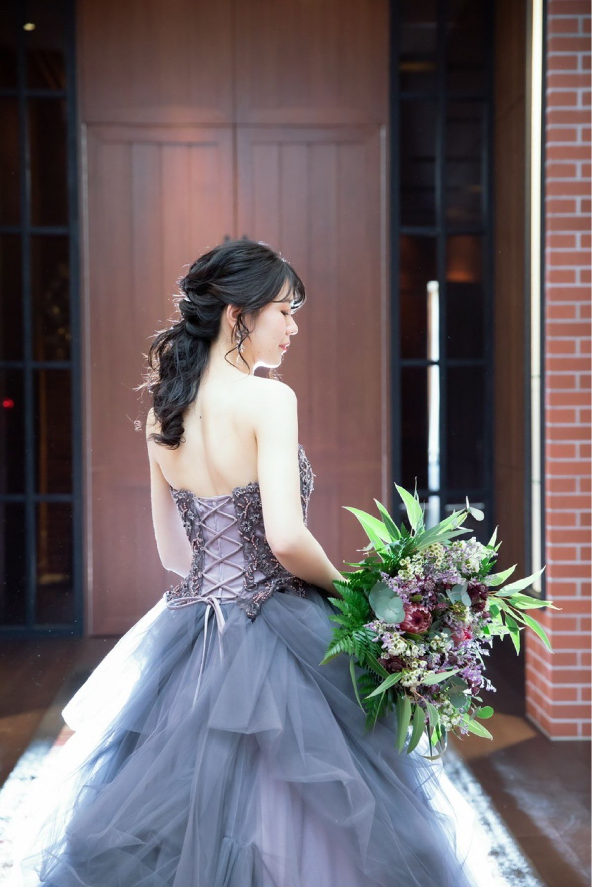 WDがスッキリしたラインだったので、デザインの変化が欲しくてチュールのふわふわしたドレスにしました。グレーの下地にパープルが入ったドレスは大人っぽく、夫も母も良いね!と言ってくれたのでこれにしました。