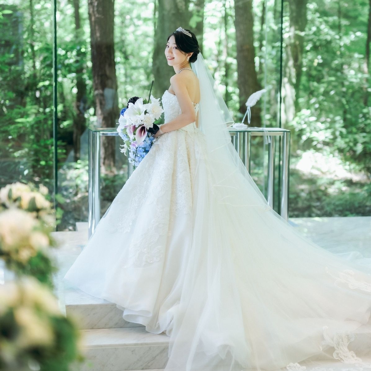 自然が豊かなのでナチュラルな雰囲気の教会かと思われがちですが、実際は光沢のある白を基調としていてゴージャスなドレススタイルもとても映えました!