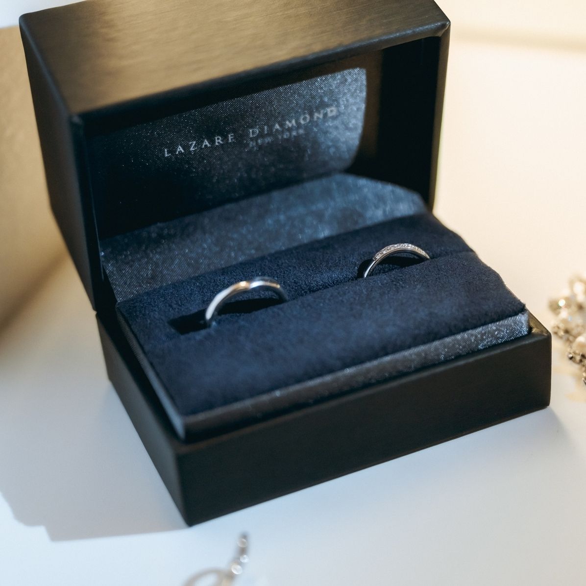 2人ともモデルは違いますがV字デザインで揃え、夫はシンプル、私は半分ダイヤの入ったものを選びました。ダイヤの輝きとサイズ感が調和したほどよい華やかさがお気に入りです。