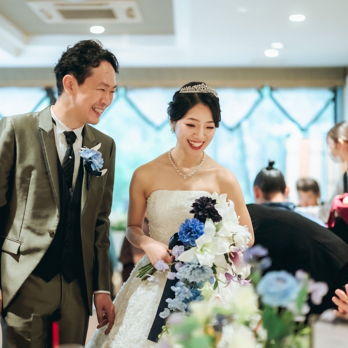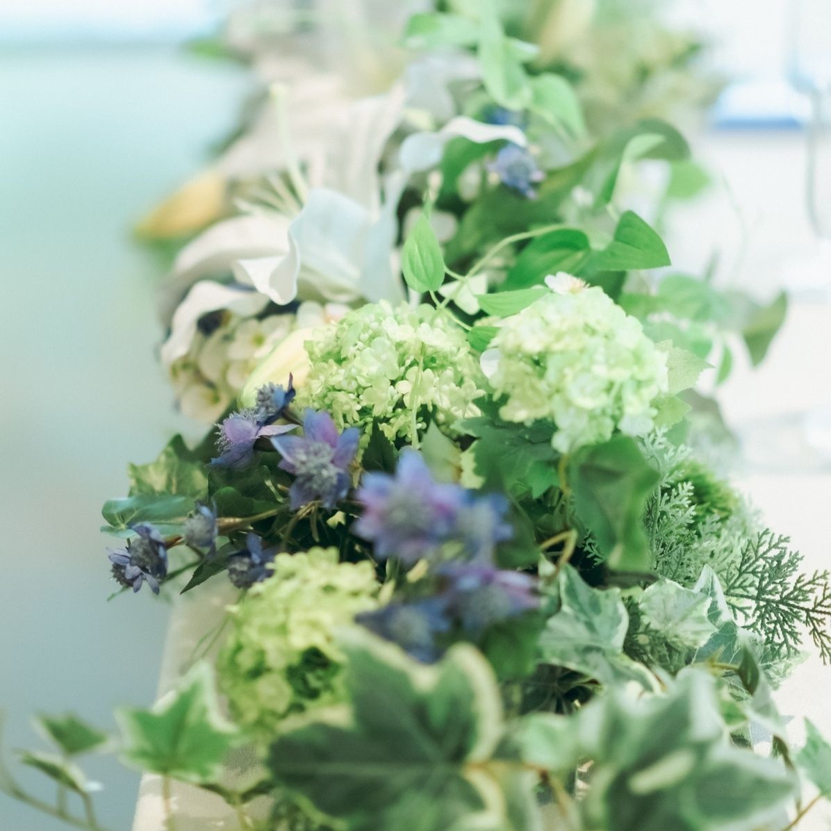 ブーケは百合がメインのブルー系となっていたため、高砂はグリーンに百合とブルーの小花を添えて、ゲストテーブルはブルーのラナンキュラスをメインに高砂にも使用した小花を織り交ぜて全体の統一感を出してくださいました。