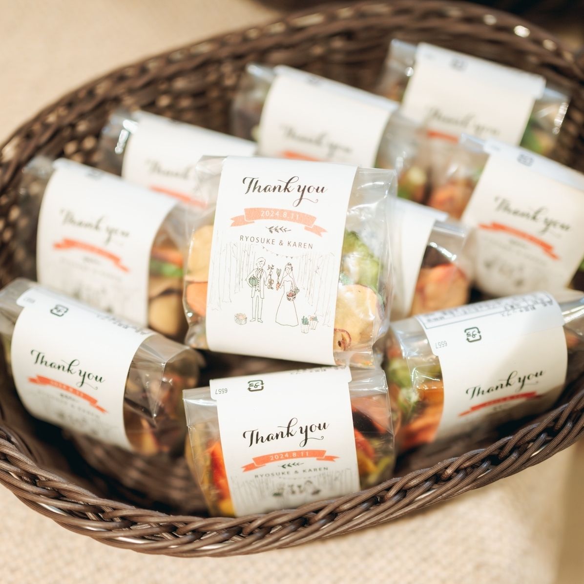 持ち込みで軽井沢ホテルブレストンコートの野菜チップスを贈りました。名前と日付も入れられるので、記念にもなりますし、味も美味しかったです。