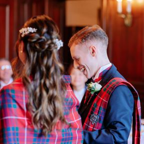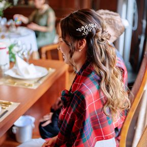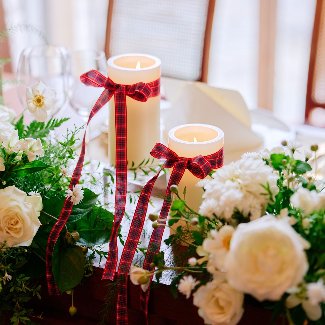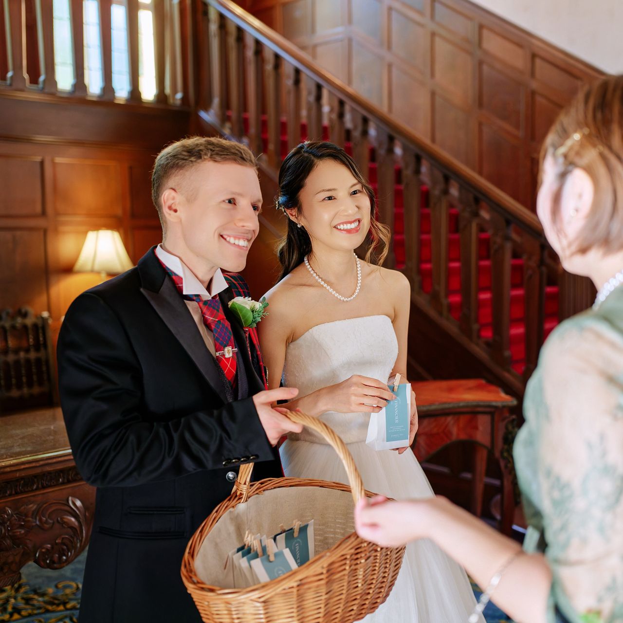 アメリカ人夫のルーツであるスコットランドのウェディングスタイルを取り入れました。私はタータンチェックのストールを身につけ、夫は同じくタータンの細長い布を肩から掛け、ネクタイもタータンで揃えました。ブーケやデコレーションにもタータンのリボンを使ってもらいました。
