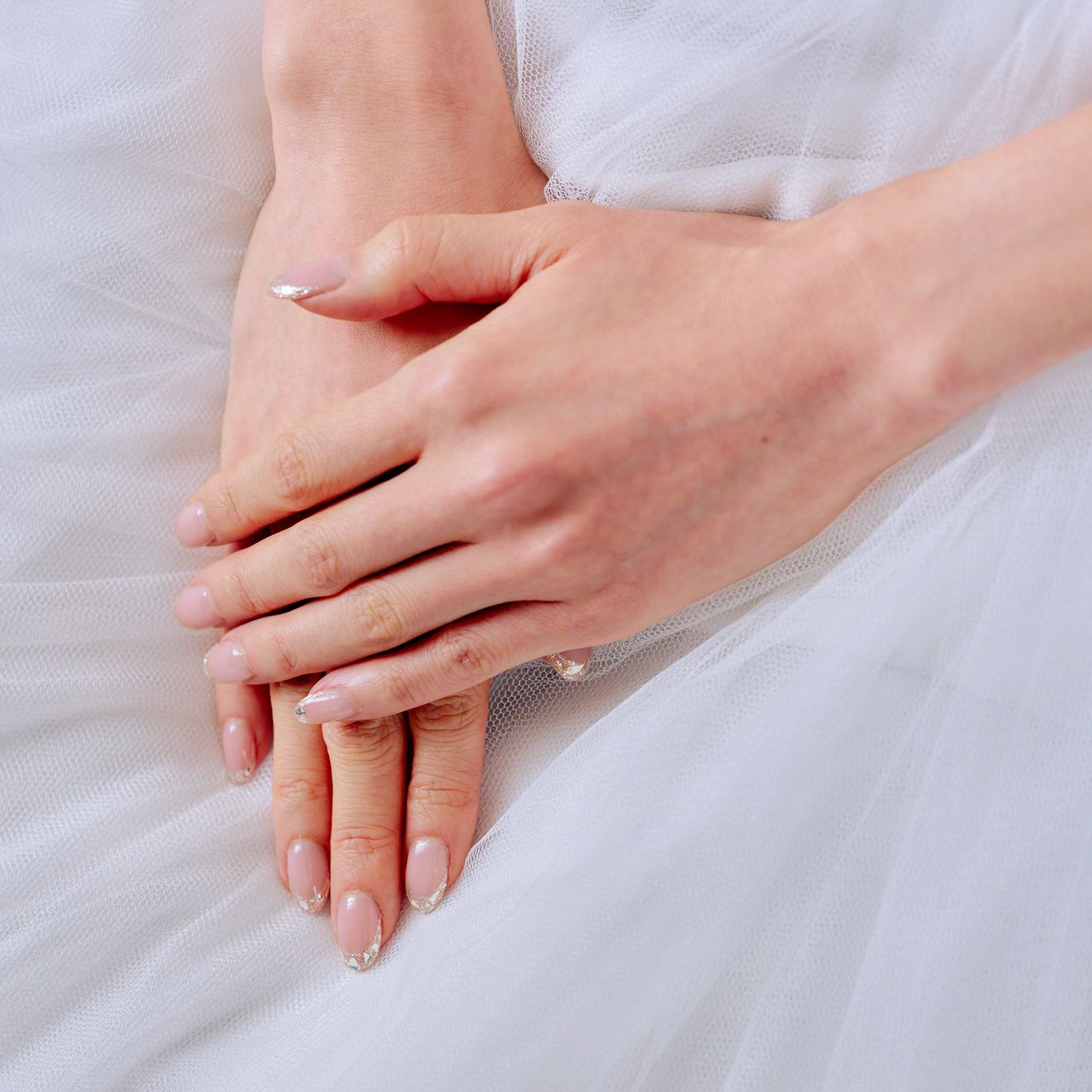 シンプル且つ華やかに見えるガラスフレンチにしました。ベースは肌に馴染むピンク系ベージュ、爪の先はシルバーでキラキラにしてもらいました。