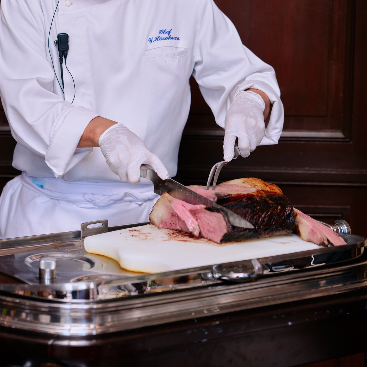試食会で頂いて気に入ったローストビーフをメニューに入れてもらいました。シェフが目の前でお肉を切り分けてくれて、ゲストにも好評でした。